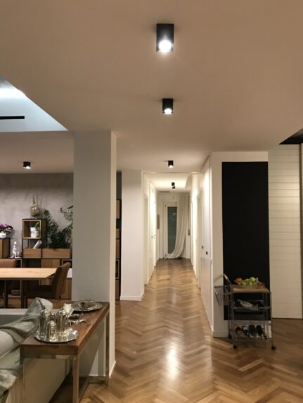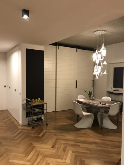Un ambiente accogliente dal gusto metropolitano in cui il recupero del parquet a spina di pesce e gli arredi lignei su misura conferiscono all’intervento una calda eleganza in combinazione con toni del bianco e del nero in un’atmosfera classica e moderna al tempo stesso.