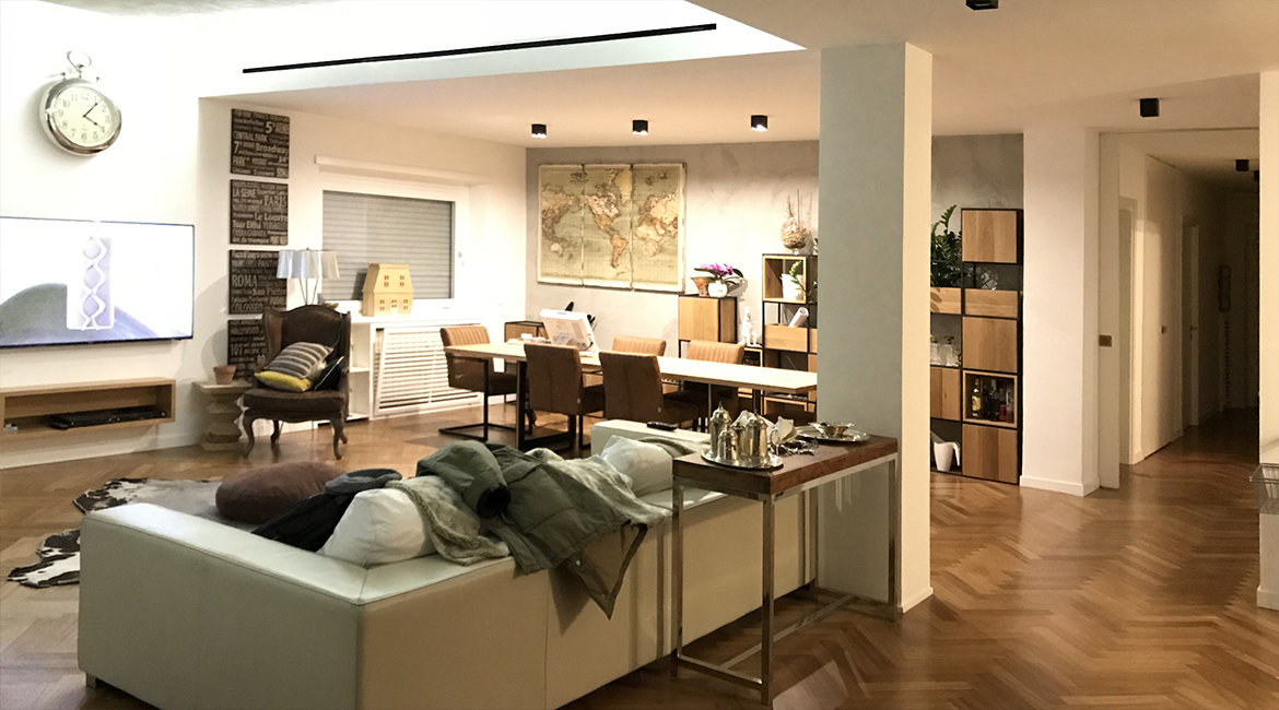 L’appartamento di circa 160 mq è collocato al piano attico di un condominio nella centrale via Ugo De Carolis nel quartiere Balduina. Dalla sue grandi terrazze disposte agli estremi opposti dell’appartamento è possibile godere dello skyline capitolino da nord a sud scorgendo la maestosa cupola di San Pietro.