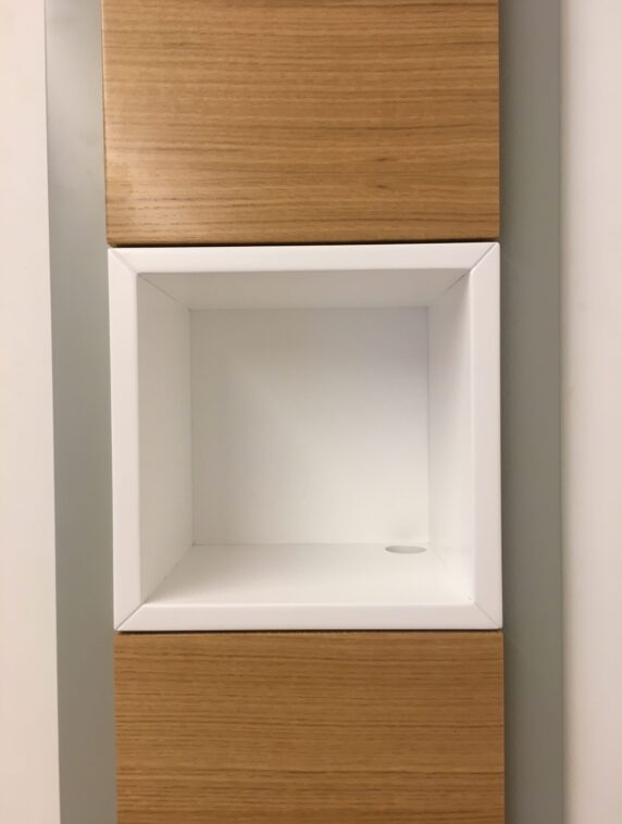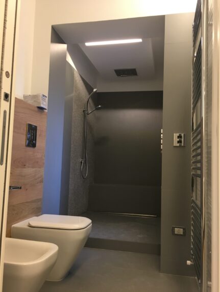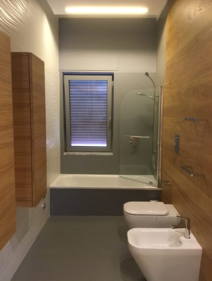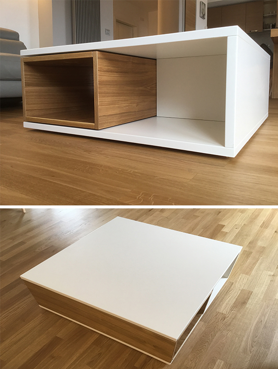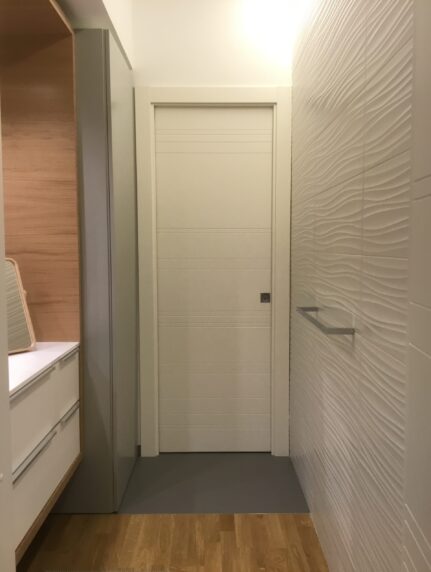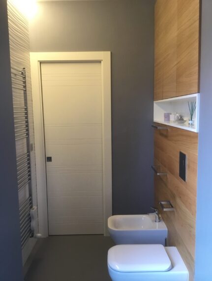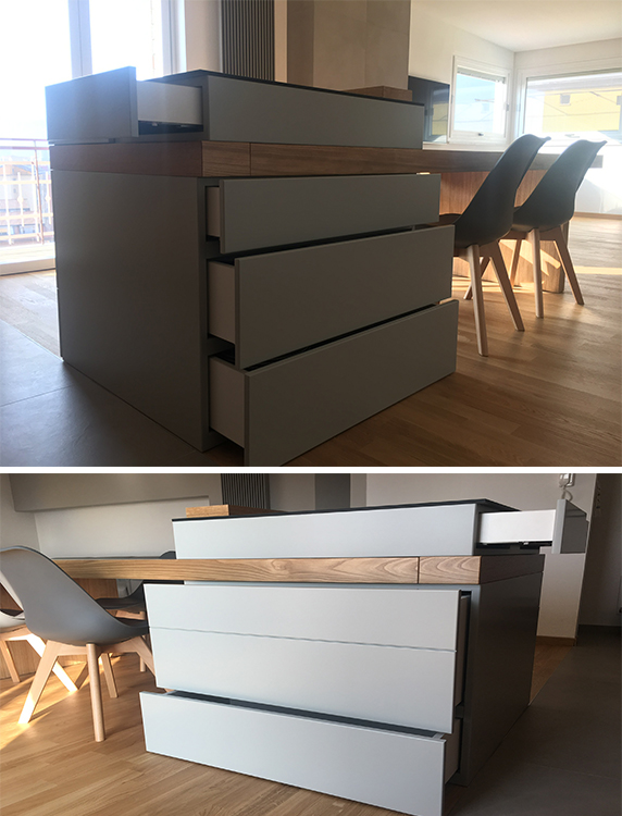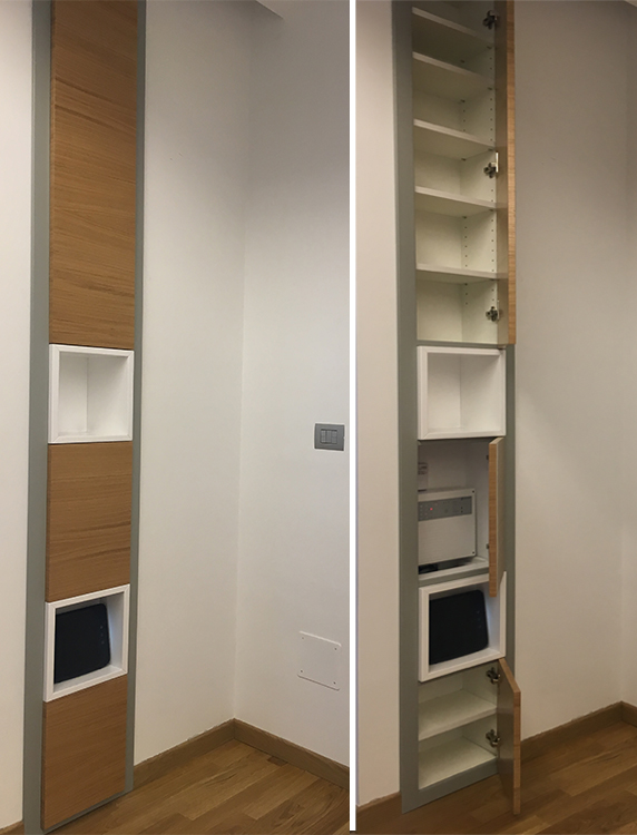 Le pareti attrezzate, gli armadi, il tavolo da pranzo/isola cucina, gli elementi contenitori dei bagni e della cucina e della zona corridoio sono stati realizzati su progetto dallo stesso studio. In fase di progettazione l’intervento è stato calibrato in modo che l’appartamento fosse già predisposto alla eventuale trasformazione in due unità abitative.