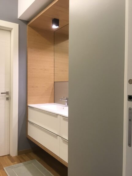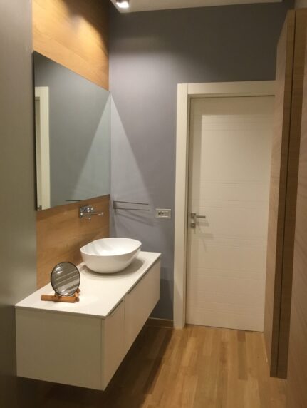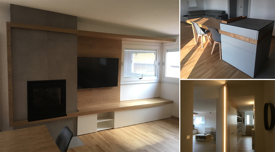 L’intervento ha radicalmente trasformato lo spazio includendo uno spazio veranda prima utilizzato come locale di sgombero. I colori caldi e l’uso del rovere naturale avvolgono il visitatore sin di primi passi accompagnandolo in un susseguirsi di elementi realizzati a misura delle esigenze della committenza.