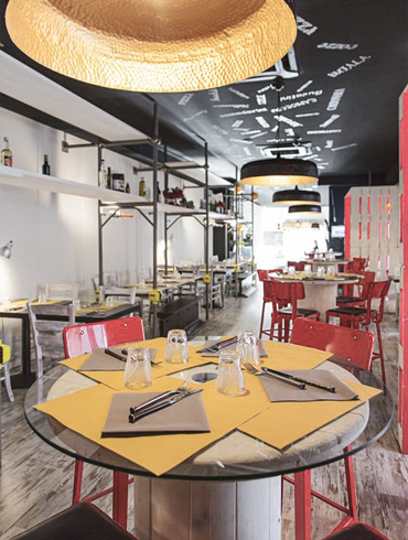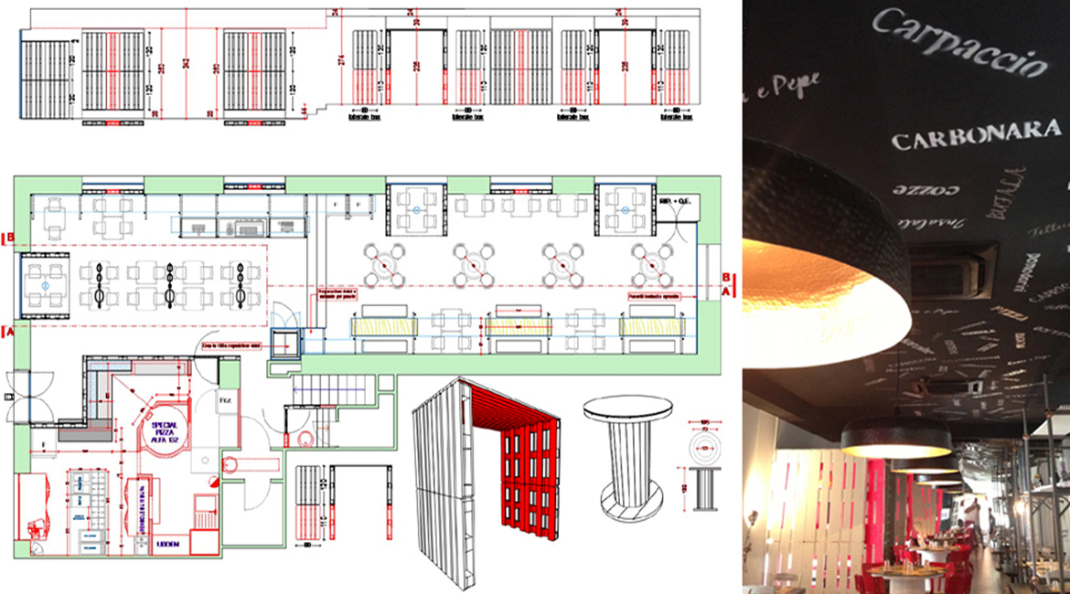 Lo studio ha sviluppato questo concept partendo dall’idea di voler ricreare quella genuina convivialità che si genera all’interno di ogni cantiere all’ora del pranzo; cosi attrezzature e oggetti tipici dell’edilizia sono diventati fonte ispiratrice del mood del ristorante.